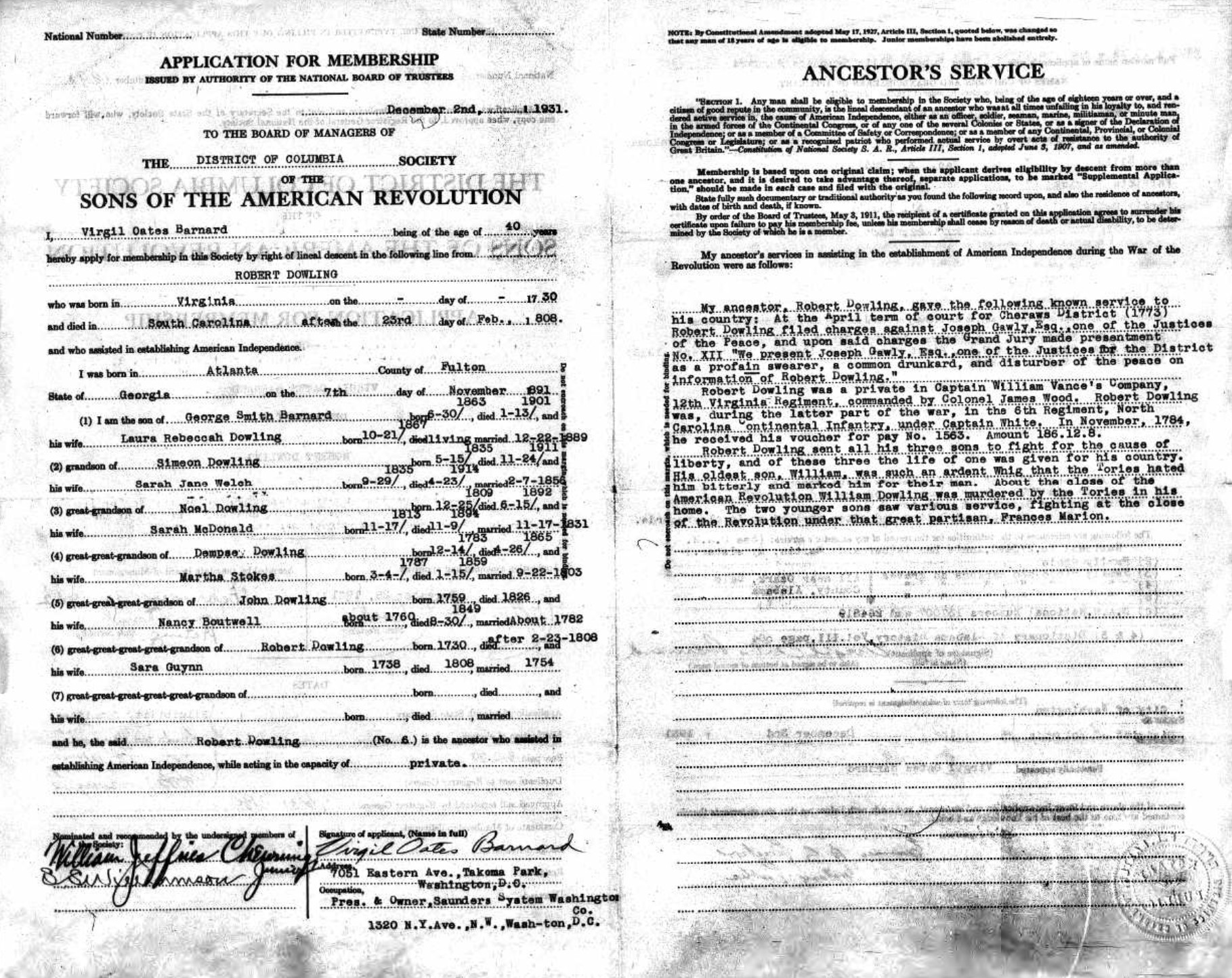 SAR Application - DC Society - December 2 1931 for Virgil Oates Barnard