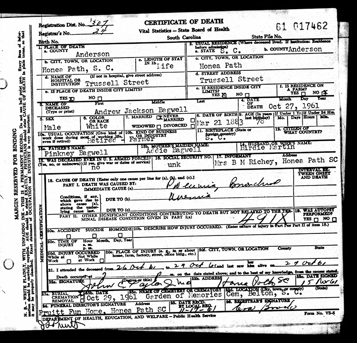 Andrew Jackson Bagwell - 1883 to 1961