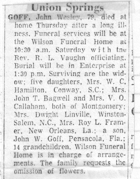 John Wesley Goff's Obituary