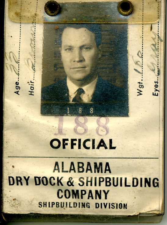 Work Badge for the Mobile Bay Dry Dock and Shipbuilding were the he helped make the Liberty Ships that help supply the Allies with supplies during World War II.
