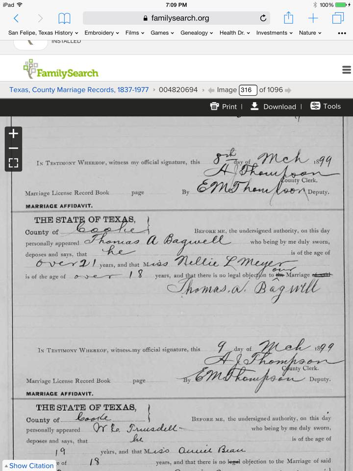 Marriage License between Thomas Arthur Bagwell and Nellie Louise Myers (Meyer)