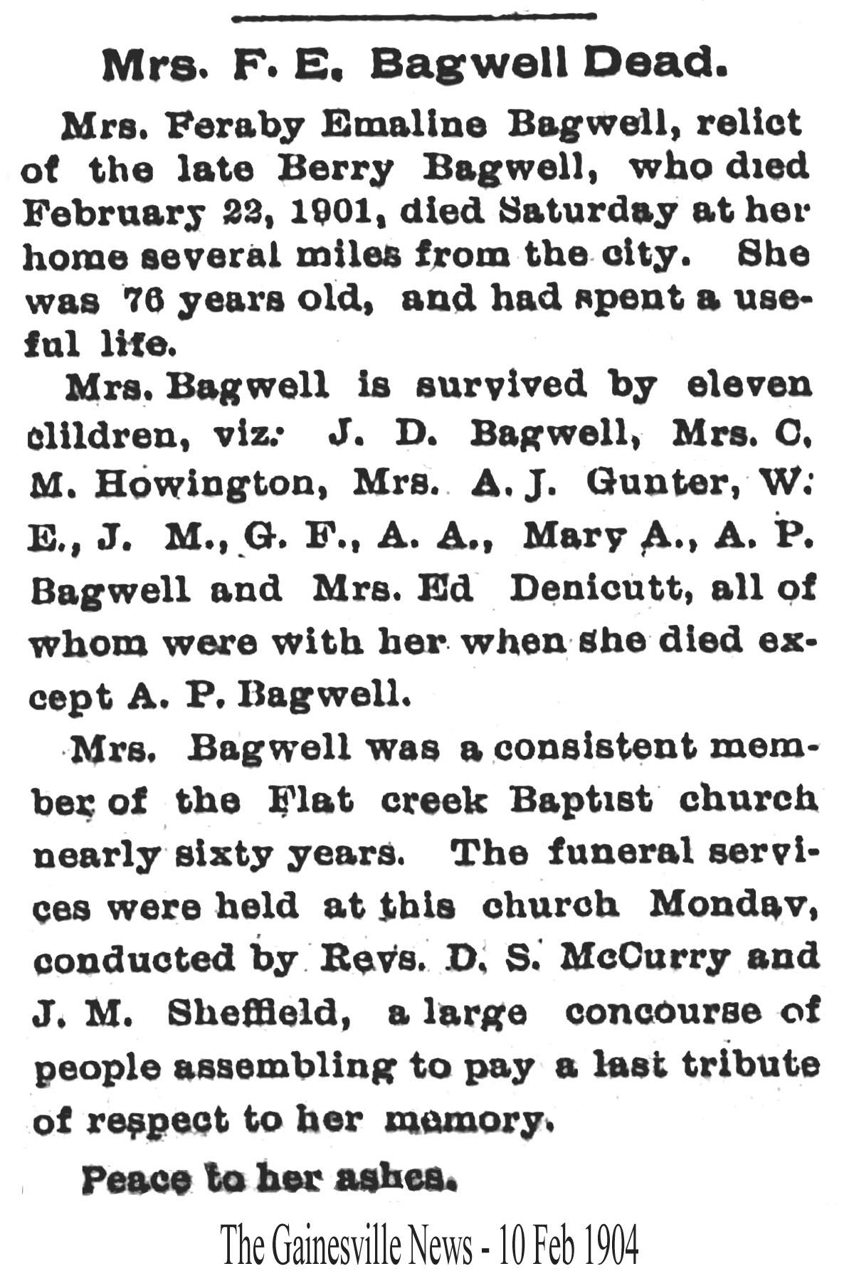 Phereby Emeline "Emily" (Strickland) Bagwell Obituary