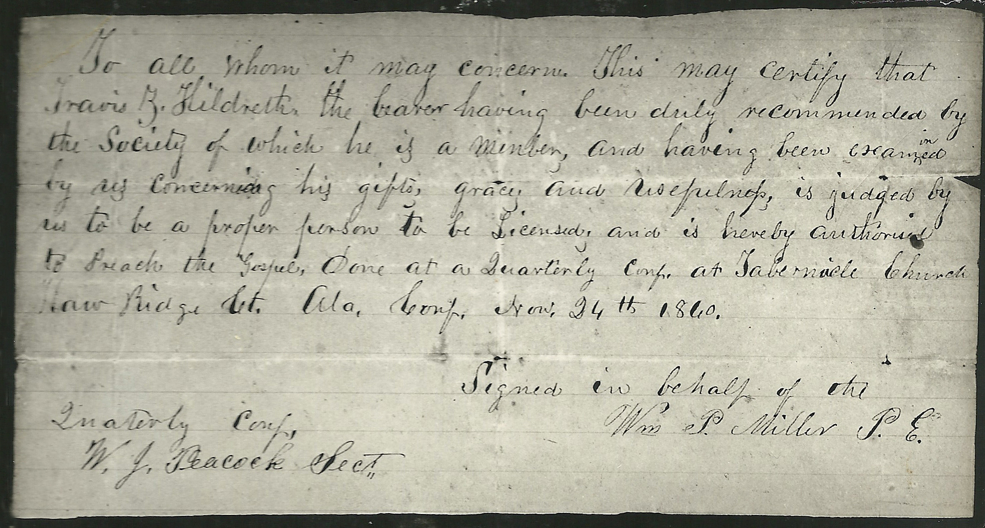 Travis Zaccheus Hildreth's Certificate to 'Preach the Gospel'
