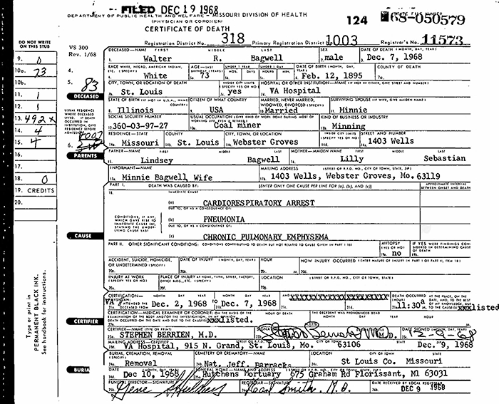Walter Ralph Bagwell was born on 12 February 1896 in Campbell Hill, Jackson County, Illinois.1 He was the son of Lindsay E. Bagwell and Lillie J. Sebastian. Walter Ralph Bagwell married Minnie Margaret Kramm on 13 March 1930 at Indiana.2 Served as a Sergent, Company E, 51st Infantry in the US Army during World War I and World War II.1 Walter Ralph Bagwell and Minnie Margaret Kramm lived in 1950 in St. Louis, St. Louis County, Missouri. Walter Ralph Bagwell died on 7 December 1968 in VA Hospital, St. Louis, Missouri, at age 72.1 He was buried on 10 December 1968 at Jefferson Barracks National Cemetery, Lemay, St. Louis County, Missouri.1