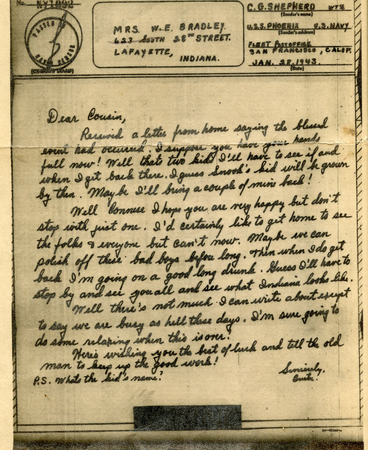 Correspondence dated January 28, 1943 from the U.S.S. Phoenix (US Navy) during World War II
