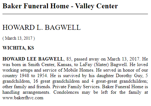 Howard Lee Bagwell was born on 23 April 1931 in Smith Center, Smith County, Kansas. He was the son of LaFaye Monaetta Slater. He served in the US Air Force. Howard Lee Bagwell married Anita Elaine Edmondson before 1949. Howard Lee Bagwell died on 13 March 2017 in Wichita, Sedgwick County, Kansas, at age 85. He was cremated.