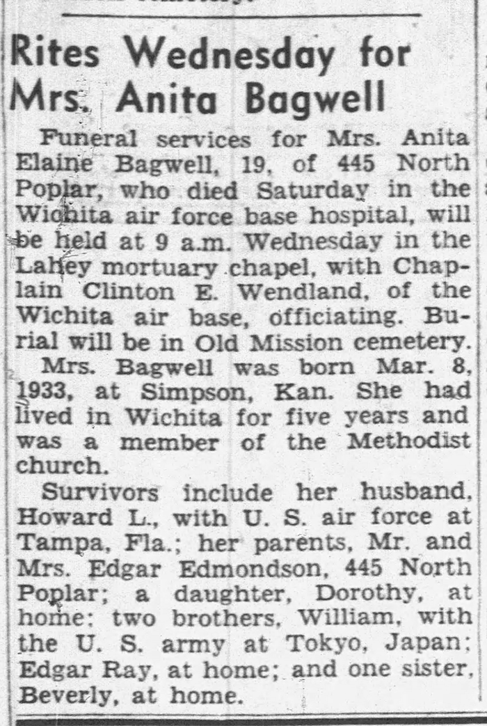 Anita Elaine Edmondson was born on 8 March 1933 in Simpson, Mitchell County, Kansas. As of before 1949,her married name was Bagwell. She married Howard Lee Bagwell, son of LaFaye Monaetta Slater, before 1949. Anita Elaine Edmondson died on 26 July 1952 in Wichita, Sedgwick County, Kansas, at age 19. She was buried on 30 July 1952 at Old Mission Cemetery, Wichita, Sedgwick County, Kansas.