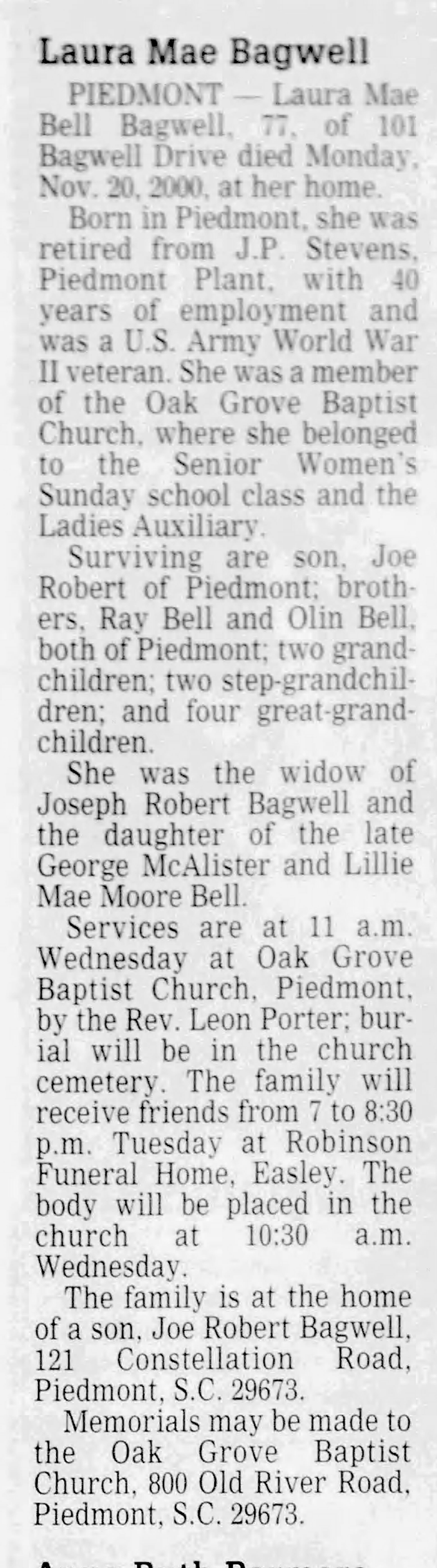 Laura Mae Bell was born on 12 May 1923 in South Carolina. As of after 1941,her married name was Bagwell. She married Joseph Robert Bagwell, son of Julius Eugene Bagwell and Lula J. Julian, after 1941. Laura Mae Bell died on 20 November 2000 in Piedmont, Anderson County, South Carolina, at age 77. She was buried at Oak Grove Cemetery, Piedmont, Anderson County, South Carolina.