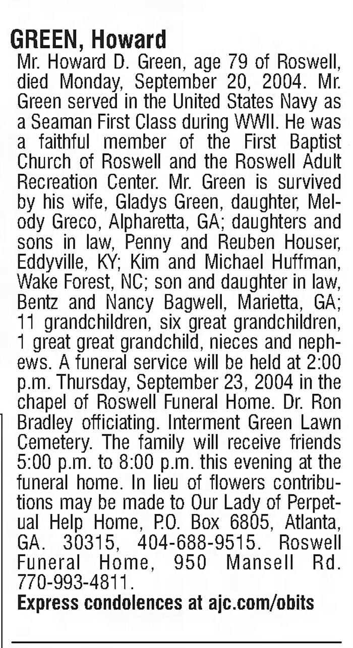 Howard D. Green was born in 1925. He married Gladys Juanita Bell after 1965. Howard D. Green died in 2004. He died on 20 September 2004 in Rosewell, Georgia. He was buried on 23 September 2004 at Greenlawn Cemetery, Atlanta, Georgia.