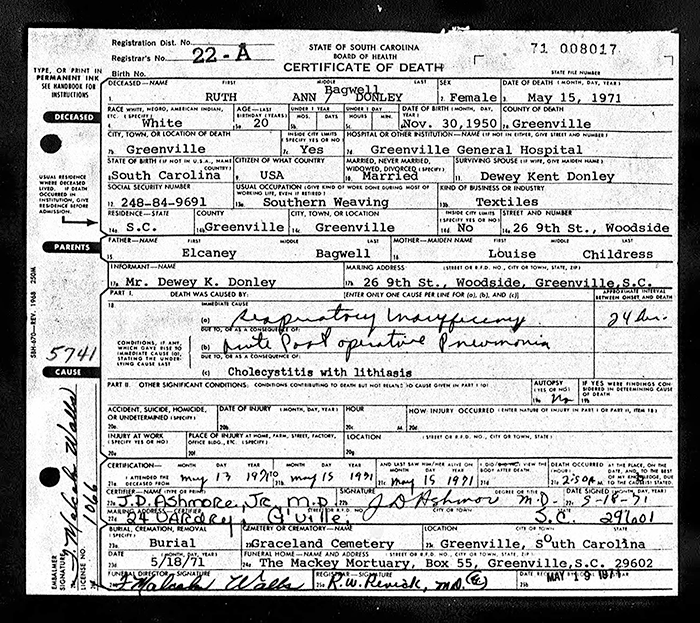 Ruth Ann Bagwell was born on 30 November 1950 in South Carolina. She was the daughter of Fred Elcaney Bagwell and Louise Childress. As of after 1970,her married name was Donley. Ruth Ann Bagwell married Dewey Kent Donley after 1970. Ruth Ann Bagwell died on 15 May 1971 in Greenville, Greenville County, South Carolina, at age 20. She was buried on 18 May 1971 at Graceland Cemetery, Greenville, Greenville County, South Carolina.