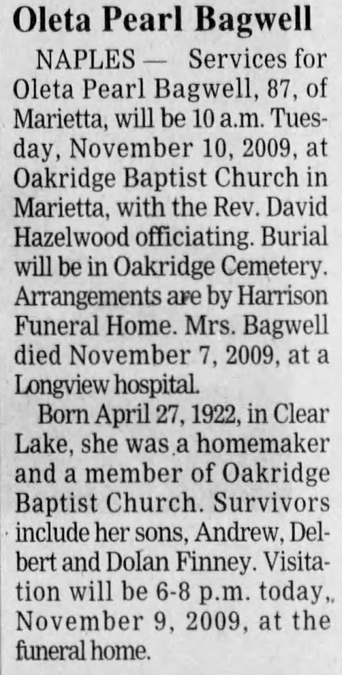 Oleta Pearl Hatfield was born on 27 April 1922 in Clear Lake, Texas. As of 1939,her married name was Finney. She married Clyde A. Finney in 1939 at Collin County, Texas. As of 20 August 1963,her married name was Bagwell. Oleta Pearl Hatfield married Maxie Lee Bagwell, son of Robert Pickney Bagwell and Elizabeth Jane Senn, on 20 August 1963 at Rockwall County, Texas. Oleta Pearl Hatfield died on 7 November 2009 in Longview, Texas, at age 87. She was buried on 10 November 2009 at Oakridge Cemetery, Marietta, Cass County, Texas.