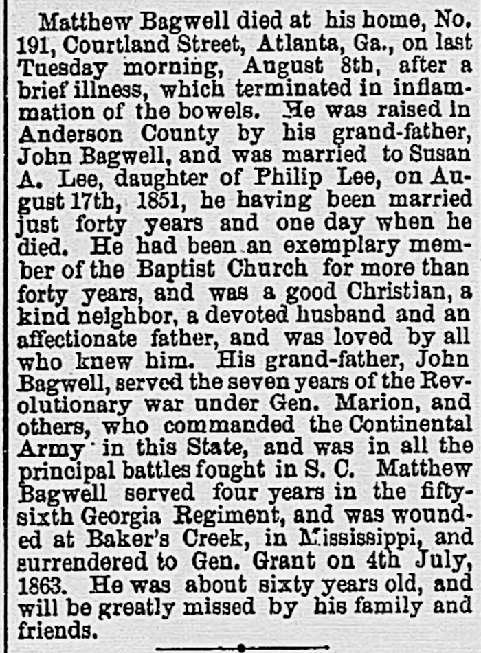 Mathew Warren Bagwell Jr. and Susan Amanda Lee lived in 1870 in Gwinnett County, Georgia.2 Mathew Warren Bagwell Jr. and Susan Amanda Lee lived in 1880 in Big Creek, Milton County, Georgia.1 Mathew Warren Bagwell Jr. died on 18 August 1891 in Gwinnett County, Georgia, at age 59. His tombstone indicates his death as August 12, 1891.6,4,5 He was buried at Sweetwater Baptist Church and Cemetery, Duluth, Gwinnett County, Georgia.5