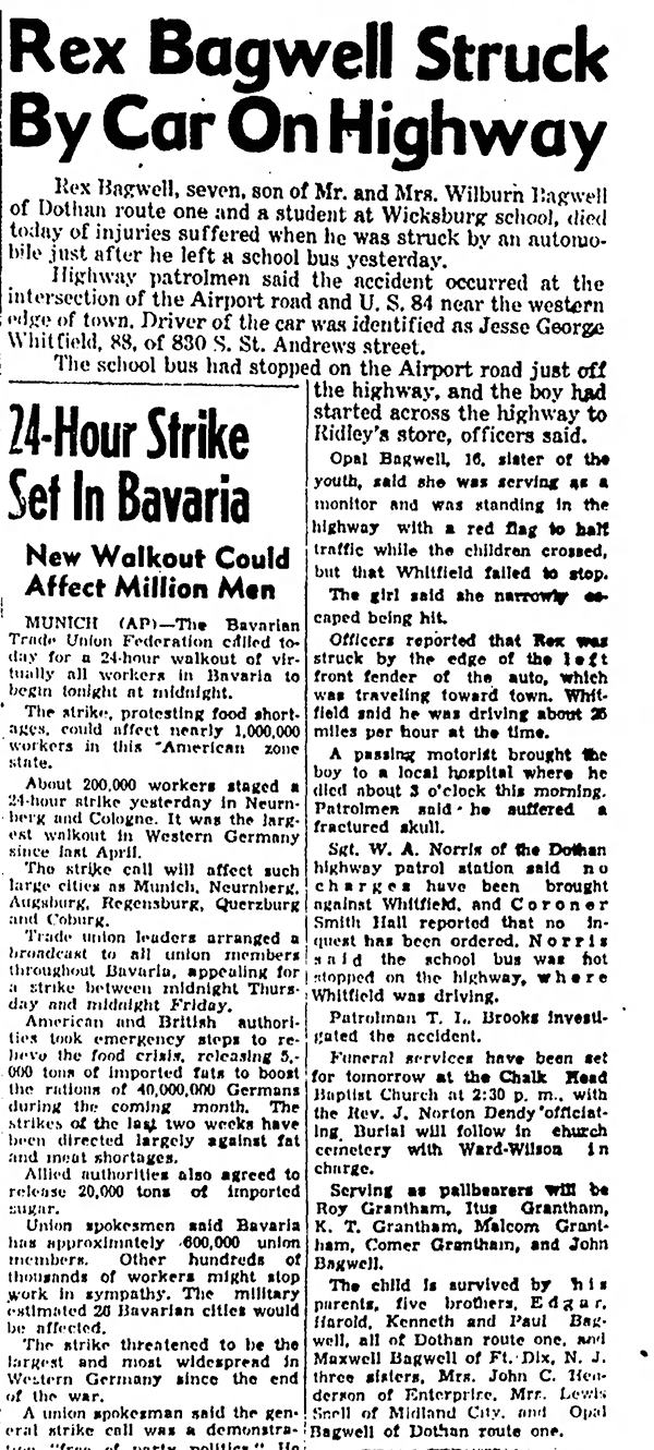 - Rex Hill Bagwell b. 16 Mar 1941, d. 21 Jan 1948