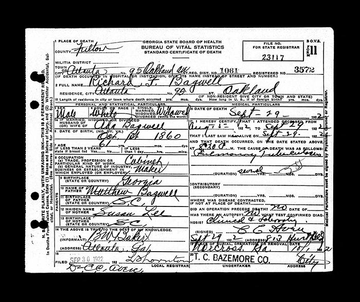 Richard Ferman Bagwell was born on 1 October 1860 in Georgia.1,2,3,4 He was the son of Mathew Warren Bagwell Jr. and Susan Amanda Lee.4 Richard Ferman Bagwell married Nancy Alice (?) on 12 May 1881 at Milton County, Georgia. Richard Ferman Bagwell married Mary Elizabeth Barnett on 9 August 1893 at DeKalb County, Georgia.5,4 Richard Ferman Bagwell married Laura Ward on 5 March 1905 at Milton County, Georgia. Richard Ferman Bagwell died on 29 September 1922 in Fulton County, Georgia, at age 61 of pulmonary tuberculosis.3,4 He was buried on 1 October 1922 at Norcross City Cemetery, Norcross, Gwinnett County, Georgia.3