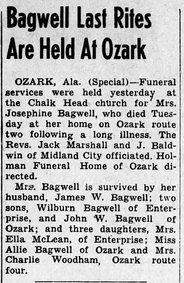 James Wiley (Wesley) Bagwell was born on 11 December 1873 in Dale County, Alabama.1 He was the son of Private Curtis G. H. Bagwell and Martha Ann Stevens. James Wiley (Wesley) Bagwell married Josephine Emeline Newton on 12 December 1895 at Dale County, Alabama. James Wiley (Wesley) Bagwell died on 10 December 1955 in Dale County Hospital, Dale County, Alabama, at age 81.1 He was buried at Chalkhead Baptist Church Cemetery, Ewell, Dale County, Alabama.1