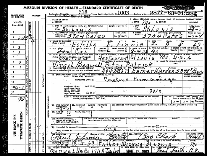 - [S7247] Estella E. Finnie, Missouri Division of Health - Standard Certificate of Death: Estalla E. Finnie.