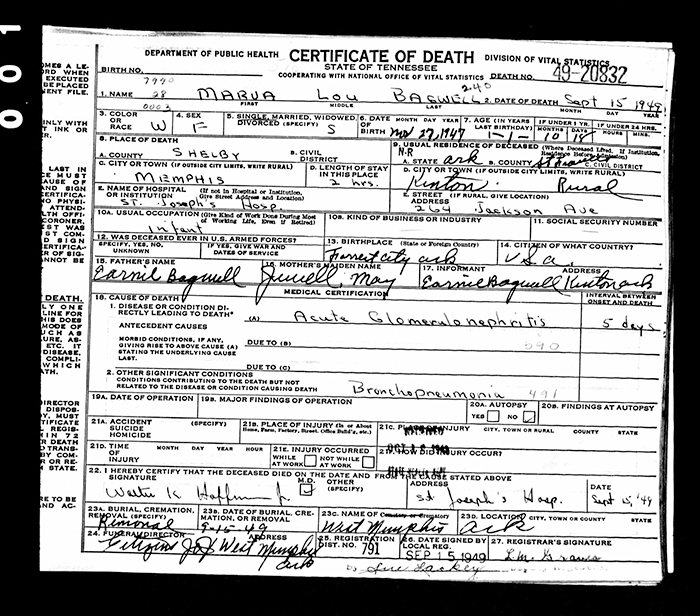 Marva Lou Bagwell was born on 27 November 1947 in Forrest City, St. Francis County, Arkansas. She was the daughter of James Earnie Bagwell and Oddie Jewel May. Marva Lou Bagwell was buried on 15 September 1949 at Fairbanks Cemetery, Fairbanks, Van Buren County, Arkansas. She died on 15 September 1949 in Memphis, Shelby County, Tennessee, at age 1 of Acute glomerulonephritis.