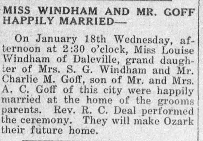Louise Windham was born on 29 March 1907 in Alabama. As of 18 January 1928,her married name was Goff. She married Charlie Myer Goff, son of Amon Camble Goff and Nancy Ida Parker, on 18 January 1928 at Ozark, Dale County, Alabama. Louise Windham died on 21 May 1976 at age 69. She was buried at Westview Cemetery, Ozark, Dale County, Alabama.
