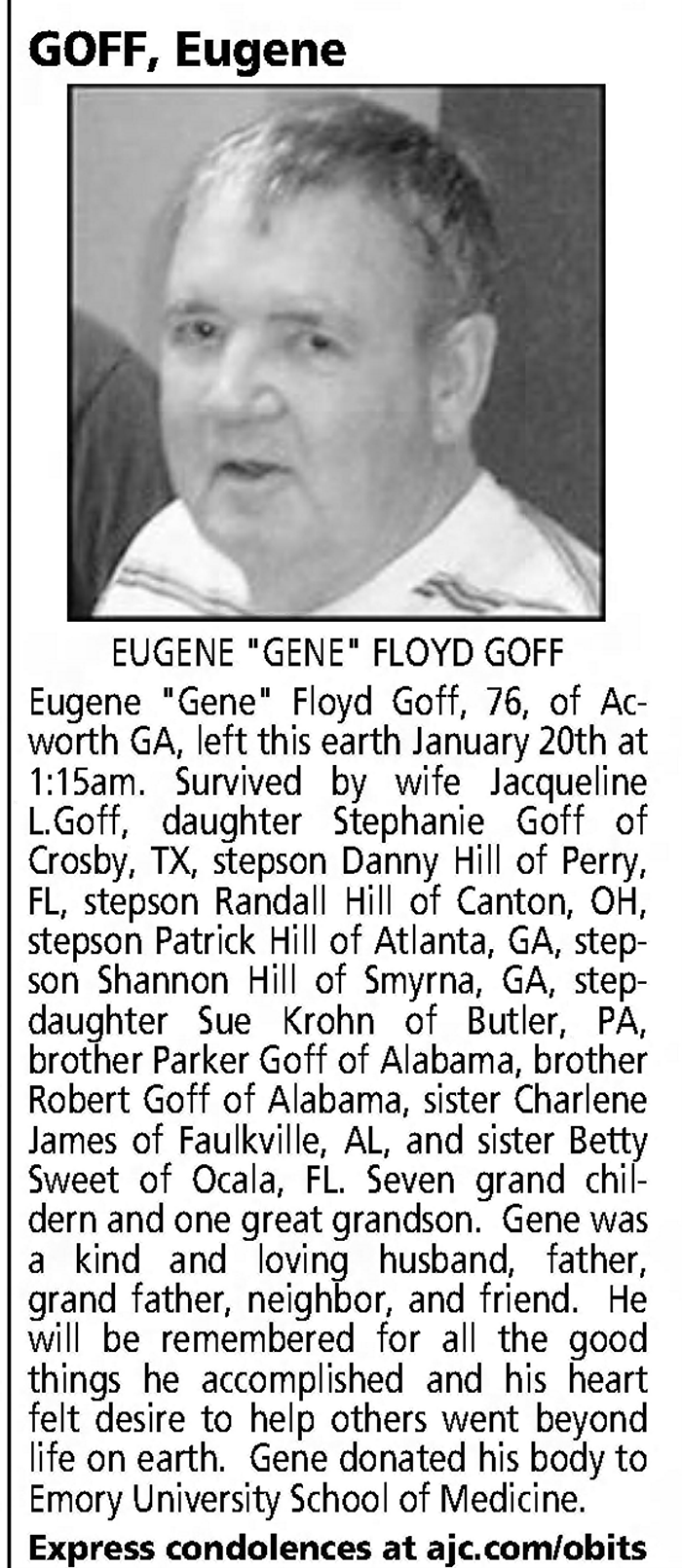 Eugene Floyd Goff was born on 23 April 1932 in Alabama. He was the son of Charlie Myer Goff and Louise Windham. Eugene Floyd Goff married Jacqueline (?) after 1955. Eugene Floyd Goff died on 20 January 2009 at age 76.
