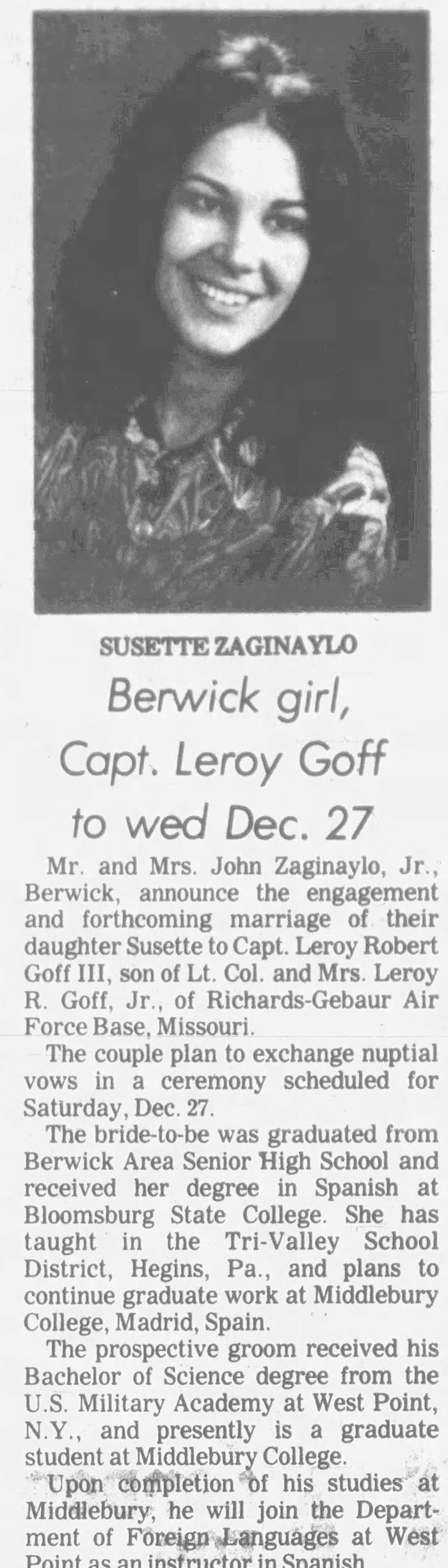 Captain LeRoy Robert Goff III is the son of Lieutenant LeRoy Robert Goff Jr. and Betty Sue Huff. Captain LeRoy Robert Goff III married Susette Zaginaylo on 27 December 1975.