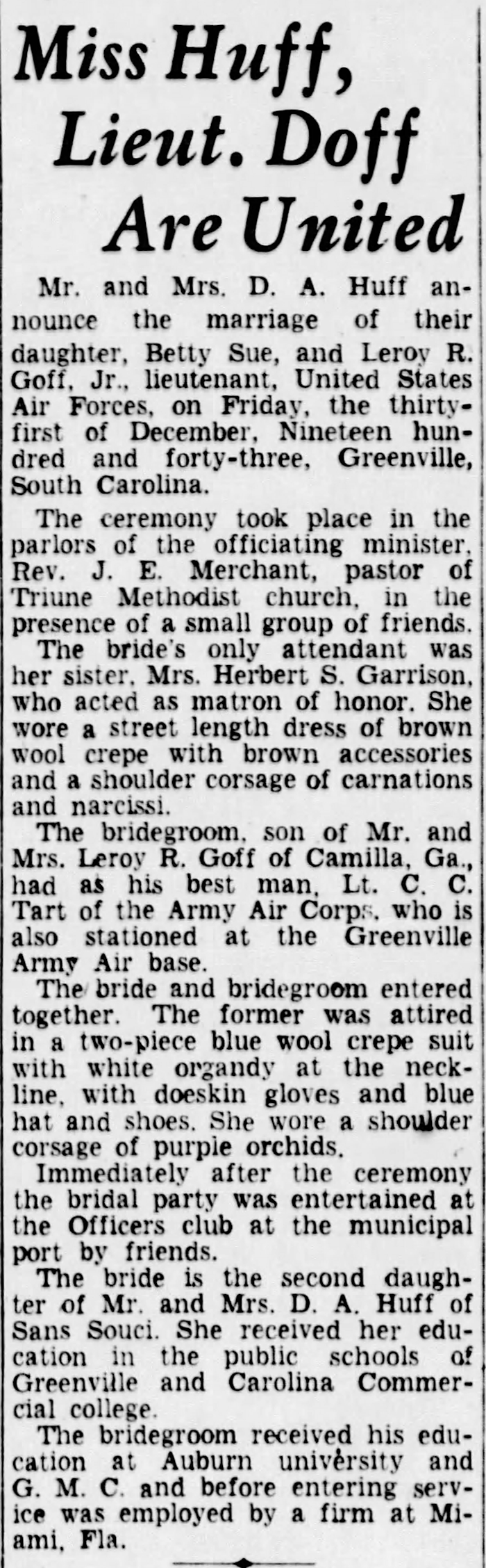 - Lieutenant LeRoy Robert Goff Jr.+ b. 23 Nov 1920, d. 13 Aug 2013