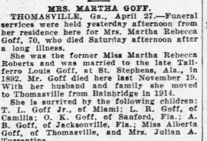 Alberta Grace Goff was born on 16 February 1896 in Alabama. She was the daughter of Taliferro Louis Goff and Martha Rebecca Roberts. Alberta Grace Goff died on 31 May 1986 at age 90. She was buried at Laurel Hill Cemetery, Thomasville, Thomas County, Georgia.