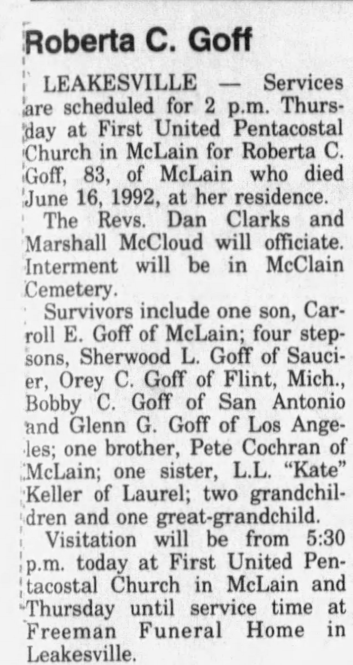 Roberta Cochran was born on 19 December 1908. As of before 1930,her married name was Goff. She married Sherwood Bradford Goff before 1930. Roberta Cochran died on 16 June 1992 in Leaksville, Mississippi, at age 83. She was buried on 18 June 1992 at McLain Cemetery, McLain, Greene County, Mississippi.