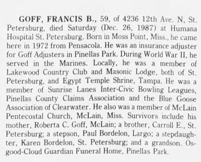Frances Burton Goff was born on 20 April 1928 in Moss Point, Mississippi. He was the son of Sherwood Bradford Goff and Roberta Cochran. Frances Burton Goff died on 15 December 1987 in St. Petersburg, Florida, at age 59. He was buried at McLain Cemetery, McLain, Greene County, Mississippi.
