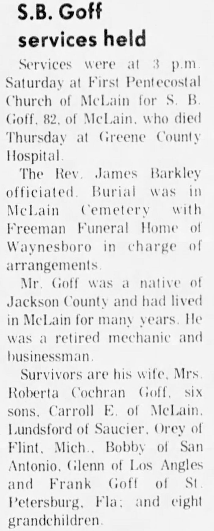Sherwood Bradford Goff was born on 12 January 1891 in Mississippi. He married Clara Vene Goff, daughter of Lyman Council Goff and Ida Lou Depriest, before 1919. Sherwood Bradford Goff married Roberta Cochran before 1930. Sherwood Bradford Goff died on 28 June 1973 in Greene County, Mississippi, at age 82. He was buried on 30 June 1973 at McLain Cemetery, McLain, Greene County, Mississippi.