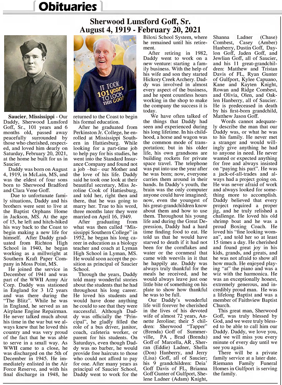 Sherwood Lunsford Goff was born on 4 August 1919 in McLain, McLain County, Mississippi. He was the son of Sherwood Bradford Goff and Clara Vene Goff. Sherwood Lunsford Goff married Annette Jeroline Cook before 1950. Sherwood Lunsford Goff died on 20 February 2021 at age 101.
