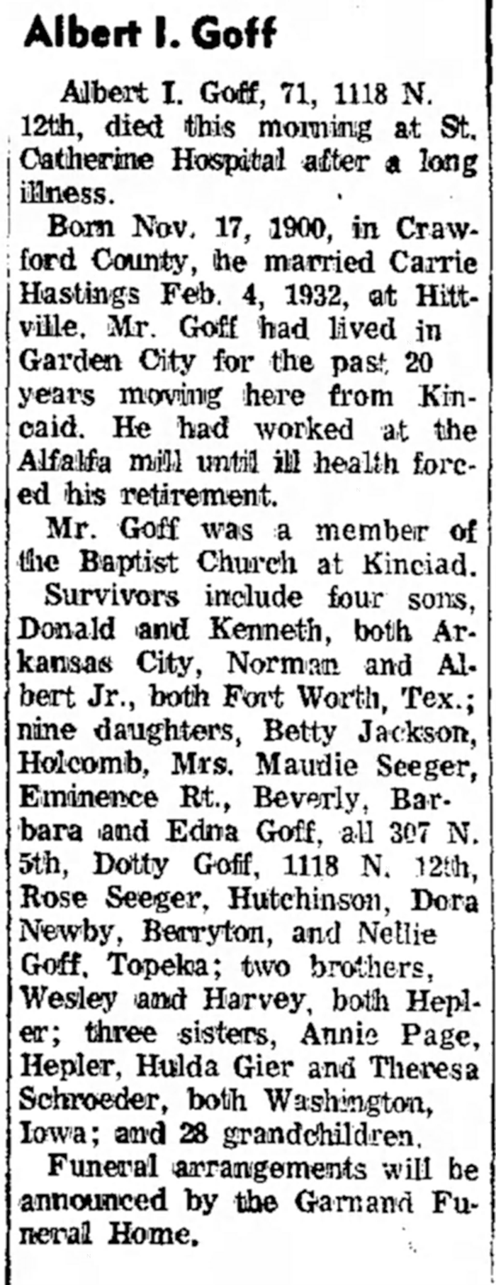 Albert Isaac Goff was born on 17 November 1900. He was the son of Thomas Elliot Goff and Margaret Glyn Glenn. Albert Isaac Goff died on 1 February 1972 at age 71. He was buried at Valley View Cemetery, Garden City, Finney County, Kansas.