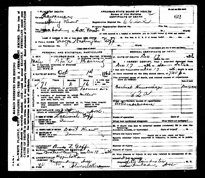 George Washington Goff was born on 10 October 1865 in Arkansas. He was the son of Zachariah Goff and Malinda (?) George Washington Goff married Martha Caroline Bratcher on 13 January 1889 at Lawrence County, Arkansas. George Washington Goff died on 17 December 1936 in Imboden, Lawrence County, Arkansas, at age 71. He was buried on 18 December 1936 at Bratcher Cemetery, Smithville, Lawrence County, Arkansas.