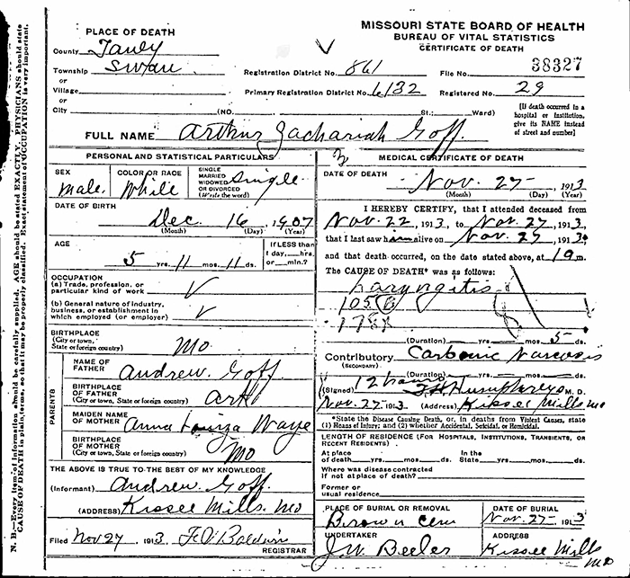 Arthur Zacharias Goff was born on 16 December 1907 in Missouri.1 He was the son of Andrew Zackaria Goff and Anna L Waye.1 Arthur Zacharias Goff was buried on 27 November 1913 at Brown Cemetery, Cedarcreek, Taney County, Missouri.1 He died on 27 November 1913 in Taney County, Missouri, at age 5.1