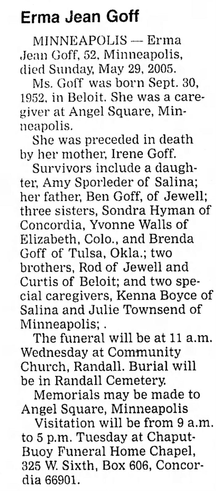 Erma Jean Goff was born on 30 September 1952 in Beloit, Kansas. She was the daughter of Benjamin Franklin Goff and Irene Marie Russell. Erma Jean Goff died on 29 May 2005 in Minneapolis, Minnesota, at age 52. She was buried at Randall Cemetery, Randall, Jewell County, Kansas.
