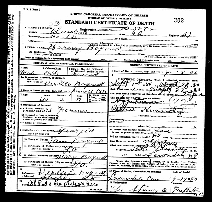 Harvey Bagwell was born on 21 June 1890 in Georgia. He married Vertie Hunt in 1927. Harvey Bagwell died on 28 September 1930 in Cleveland County, North Carolina, at age 40. He was buried at Lawndale First Baptist Church Cemetery, Shelby, Cleveland County, North Carolina.