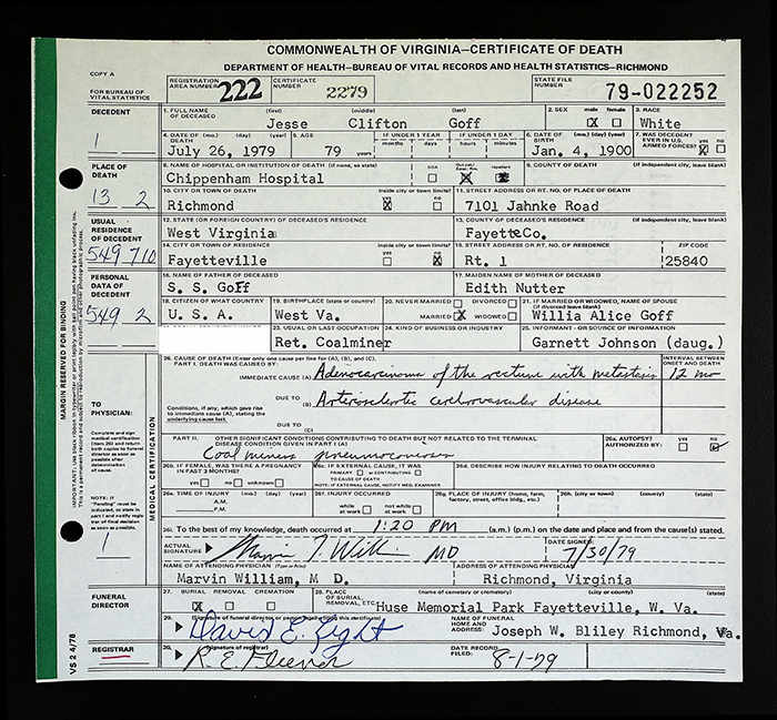 Jessie Clifton Goff was born on 4 January 1900 in Fayette County, West Virginia. He was the son of Sylvester Singleton Goff and Edith Nutter. Jessie Clifton Goff married Willis Alice Epperly on 12 November 1921 at Gatewood, Fayette County, West Virginia. Jessie Clifton Goff died on 26 July 1979 in Richmond City, Virginia, at age 79. He was buried at Huse Memorial Park, Fayetteville, Fayette County, West Virginia.