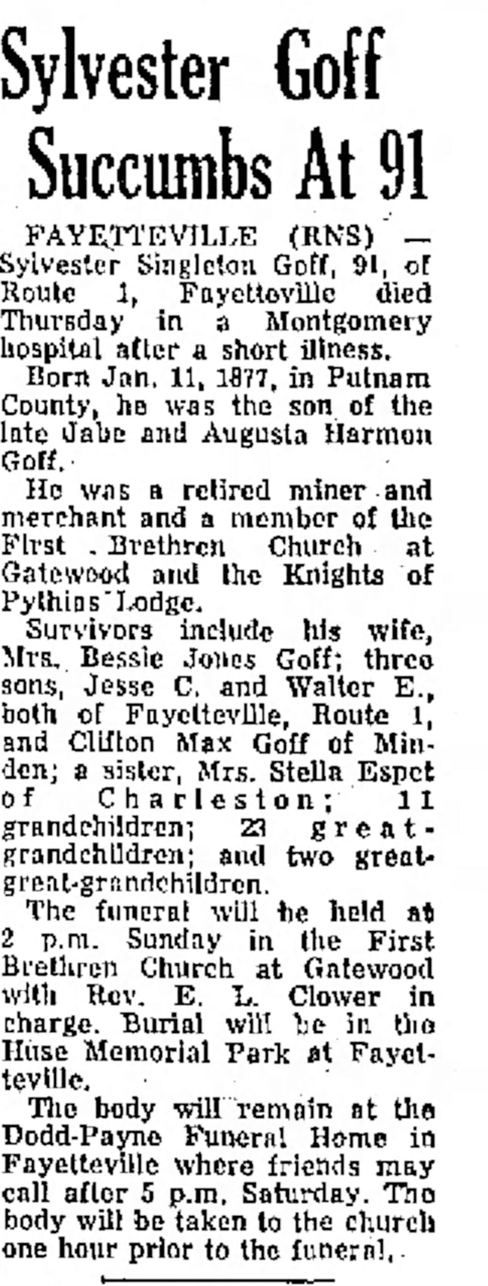 Sylvester Singleton Goff was born on 11 January 1877 in Putnam County, West Virginia. He was the son of John Goff and Augusta Viola Harmon. Sylvester Singleton Goff married Edith Nutter on 9 February 1899 at Fayette County, West Virginia. Sylvester Singleton Goff married Bessie M. Jones on 20 October 1904 at Floyd County, Virginia. Sylvester Singleton Goff died on 10 October 1968 in Montgomery, Fayette County, West Virginia, at age 91. He was buried on 13 October 1968 at Huse Memorial Park, Fayeltteville, Fayette County, West Virginia.