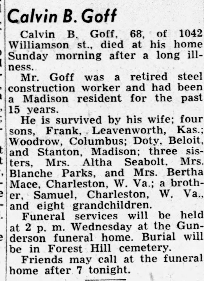 Calvin Benjamin Goff was born on 19 November 1882 in Charleston, Kanawha County, West Virginia. He was the son of William Harvey Goff and Samantha Elizabeth Rust. Calvin Benjamin Goff married Mina Overby circa 1909. Calvin Benjamin Goff died on 6 May 1951 in Madison, Dane County, Wisconsin, at age 68. He was buried on 9 May 1951 at Forest Hills Cemetery, Madison, Dane County, Wisconsin.
