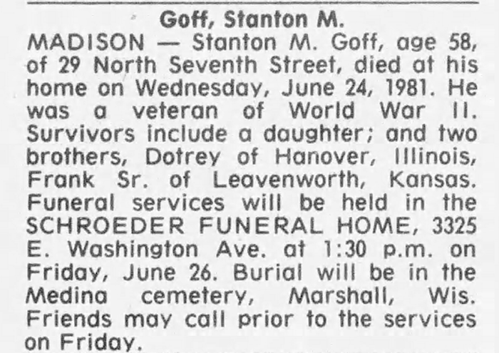 Stanton Mayo Goff was born on 1 October 1922 in Jackson County, Ohio. He was the son of Calvin Benjamin Goff and Mina Overby. Stanton Mayo Goff married Ruth Lucille Klope on 11 May 1943 at Portsmouth, New Hampshire. Stanton Mayo Goff died on 24 June 1981 in Madison, Wisconsin, at age 58. He was buried at Medina Cemetery, Marshall, Dane County, Wisconsin.