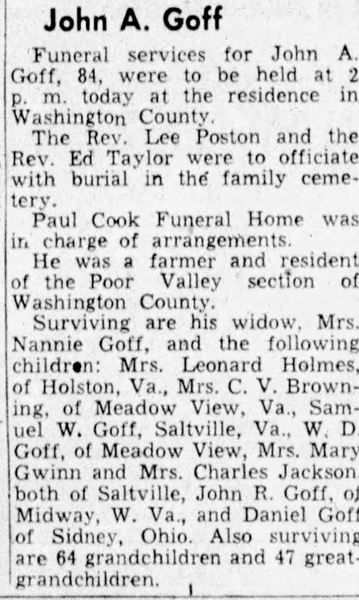 Daniel Jospeh Goff was born on 8 June 1916 in Saltville, Washington County, Virginia. He was the son of John Alexander Goff. Daniel Jospeh Goff married Eva Marie Buchanan on 24 June 1940 at Abingdon, Virginia. Daniel Jospeh Goff died on 28 December 1985 in Dayton, Montgomery County, Ohio, at age 69. He was buried at Cedar Point Cemetery, Pasco, Shelby County, Ohio.