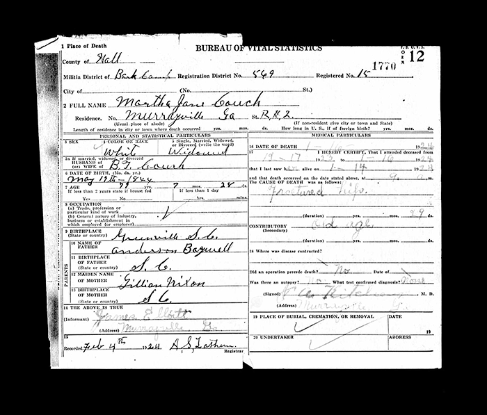 Mary Jane Bagwell was also known as Martha Jane Bagwell. She was born on 17 May 1844 in South Carolina.1,2 She was the daughter of Henderson Onie Bagwell and Margaret Stone.1,2 As of before 1870,her married name was Couch. Mary Jane Bagwell married Benjamin Terry Couch before 1870. Mary Jane Bagwell died on 16 January 1924 in Hall County, Georgia, at age 79. She was buried at Cool Springs Baptist Church Cemetery, Gainesville, Hall County, Georgia.