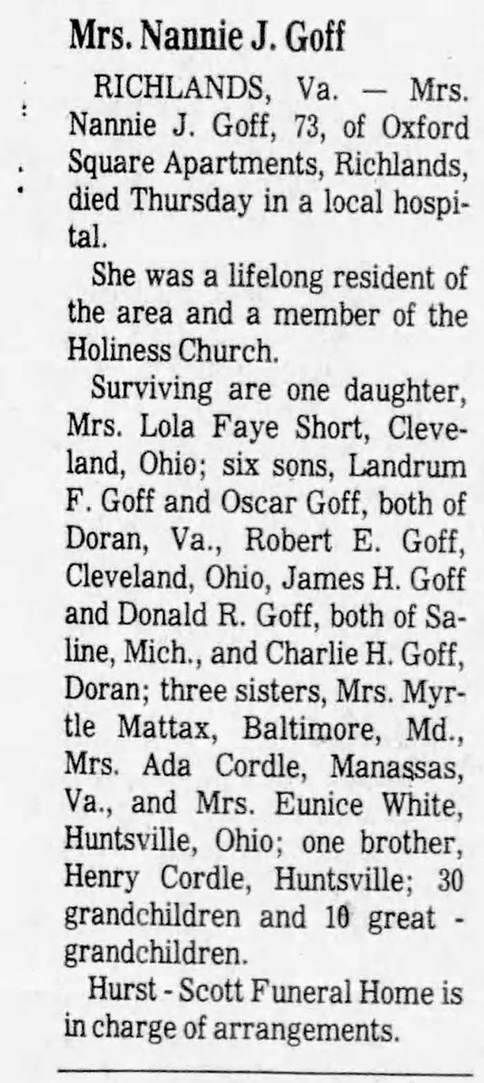 Nannie Jane Cordle was born on 19 February 1907. As of before 1930,her married name was Goff. She married Charles Hobson Goff, son of Samuel Alexander Goff and Anna Laura Sandefur, before 1930. Nannie Jane Cordle died on 15 January 1981 at age 73.