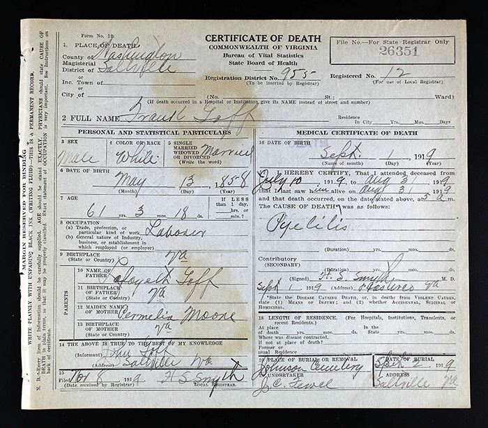 Theophilus Goff was also known as Frank Goff. He was born on 13 May 1858 in Virginia. He was the son of Lafeyette M. Goff and Permelia Ann Moore. Theophilus Goff married Jennie L. Rae on 30 October 1899 at Washington County, Virginia. Theophilus Goff died on 1 September 1919 in Saltville, Washington County, Virginia, at age 61. He was buried on 2 September 1919 at Johnson Cemetery, Washington County, Virginia.