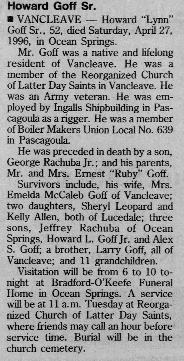 Howard Lynn Goff was born on 1 April 1944 in Jackson County, Mississippi. He was the son of William Ernest Goff and Ruby Juanita Rogers. Howard Lynn Goff married Emelda Elaine McCaleb after 1957. Howard Lynn Goff died on 27 April 1996 in Ocean Springs, Jackson County, Mississippi, at age 52. He was buried on 30 April 1996 at Community of Christ Cemetery, Vancleave, Jackson County, Mississippi.