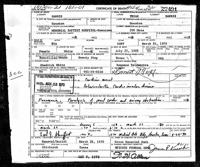 Eva White was born on 25 July 1888 in Texas. As of 22 February 1907,her married name was Goff. She married E. F. Goff on 22 February 1907 at Maverick County, Texas. Eva White died on 26 March 1970 in Houston, Harris County, Texas, at age 81. She was buried on 28 March 1970 at Hayes Grace Memorial Park, Hitchcock, Galveston County, Texas.