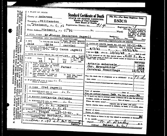 Alonzo Henderson Bagwell was also known as Lon H. Bagwell. He was born on 22 October 1877 in South Carolina. His tombstone says October 29th, 1877 as his birth date.1,2 He was the son of Frederick Bagwell and Samantha Caroline Callaham.1 Alonzo Henderson Bagwell married Ruth Augustus Burgess after 1890. Alonzo Henderson Bagwell married Mary E. Cason on 14 February 1921 at Anderson County, South Carolina. Alonzo Henderson Bagwell died on 11 December 1942 in Anderson County, South Carolina, at age 65.1,2 He was buried on 13 December 1942 at Mount Pisgah Baptist Church Cemetery, Anderson County, South Carolina.2
