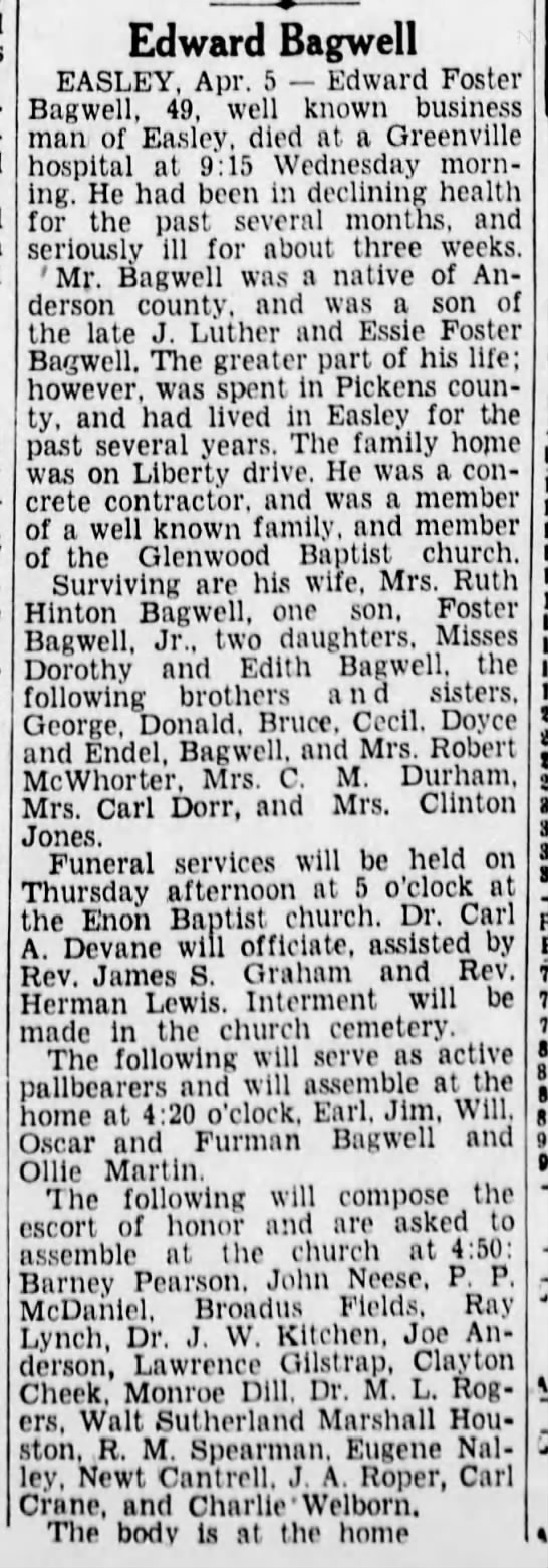 Ernest Donald Bagwell was also known as Fred Donald Bagwell. Ernest Donald Bagwell was also known as Donald Bagwell. He was born in 1907 in South Carolina.1,2 He was the son of John Luther Bagwell and Essie Jane Foster. Ernest Donald Bagwell married Grace Florine Youngblood circa 1930. Ernest Donald Bagwell died on 24 April 1964 in Pickens County, South Carolina.2 He was buried at Greenlawn Memorial Park, Greenville, Greenville County, South Carolina.2
