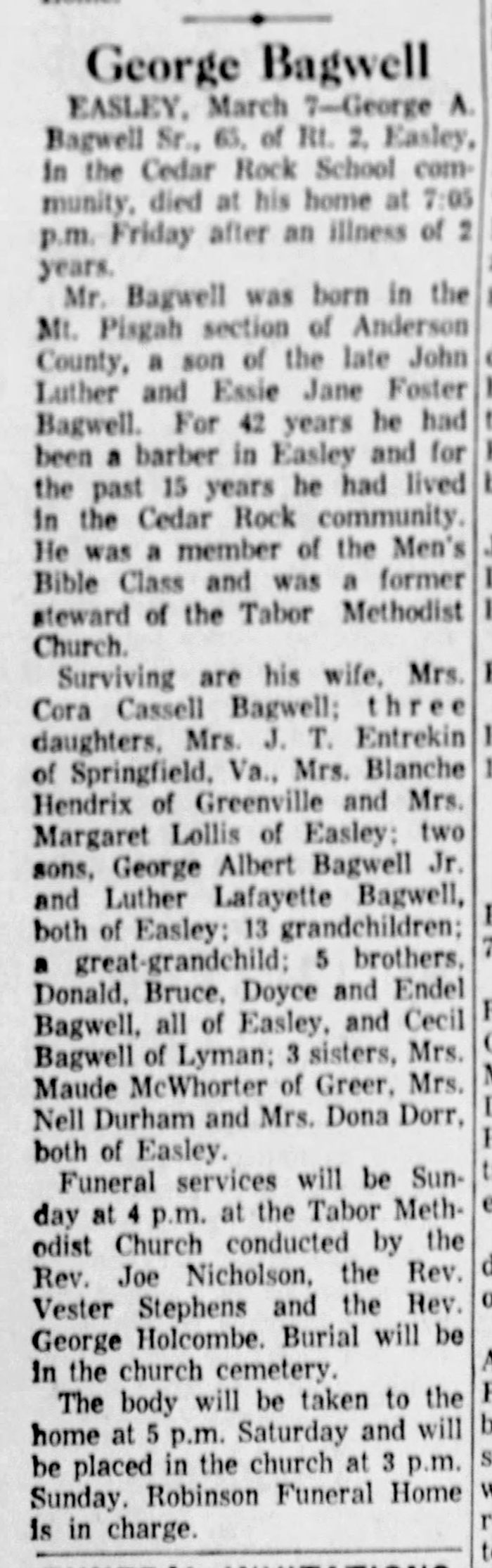 George Albert Bagwell was born on 10 November 1892 in Anderson County, South Carolina. His tombstone says he was born in 1893.1,3 He was the son of John Luther Bagwell and Essie Jane Foster. George Albert Bagwell married Cora Cassell, daughter of Edward D. Cassell and Nancy Ellen Garren, on 22 February 1916 at Pickens, South Carolina.2,4 George Albert Bagwell lived in 1930 in Easley, Pickens County, South Carolina.2 He was (an unknown value) in 1930 at barber shop, South Carolina.2 He died on 7 March 1958 in Pickens County, South Carolina, at age 65.3 He was buried on 9 March 1958 at Tabor Methodist Church, Pickens County, South Carolina.3