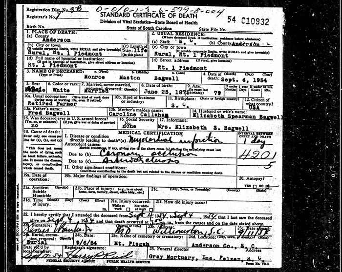 Monroe Mastin Bagwell was born on 5 June 1875 in Greenville County, South Carolina.1 He was the son of Frederick Bagwell and Samantha Caroline Callaham.2 Monroe Mastin Bagwell married Elizabeth Spearman.1,3 Monroe Mastin Bagwell died on 4 September 1954 in Anderson County, South Carolina, at age 79.2,1 He was buried on 6 September 1954 at Mount Pisgah Baptist Church Cemetery, Anderson County, South Carolina.1