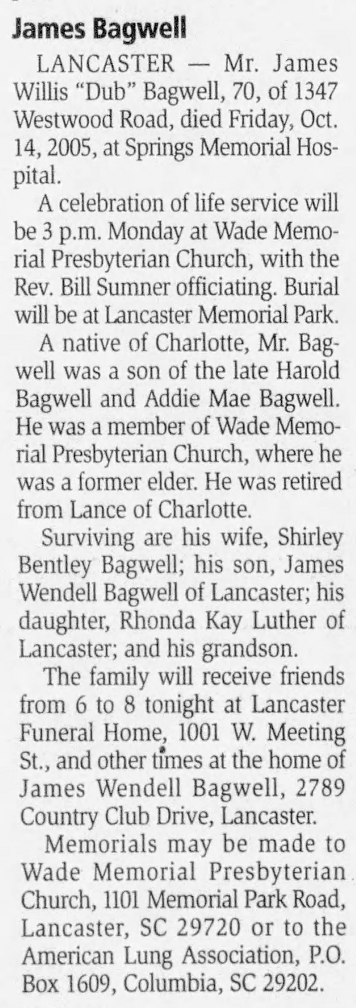 James Willis Bagwell was also known as James Withers Bagwell. He was born on 25 August 1935 in Charlotte, Mecklenberg County, North Carolina. He was the son of Harold A. Bagwell and Addie Mae Snipes. James Willis Bagwell married Shirley Carolina Bentley after 1953. James Willis Bagwell died on 14 October 2005 in Rock Hill, South Carolina, at age 70. He was buried at Lancaster Memorial Park, Lancaster, Lancaster County, North Carolina.